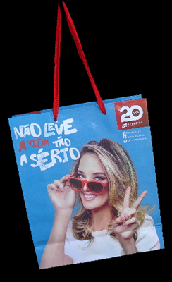 Confeccionadas em papel duplex, kraft, offset, e reciclator em varias gramaturas, com ou sem ilhós, com cordão ou gorgurão, com ou sem ponteira de acetato e também alça de papel torcido ou boca de palhaço.